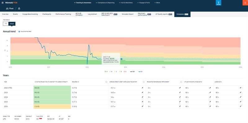 Wärtsilä’s integrated dashboard not only gives Anglo-Eastern greater visibility of how its fleet is performing on the carbon intensity front, but analyses all data from a vessel to identify the key factors affecting its rating – such as speed, route, hull and propeller condition – and what targeted, data-driven actions need to be taken to optimise CII performance over a voyage or series of voyages.