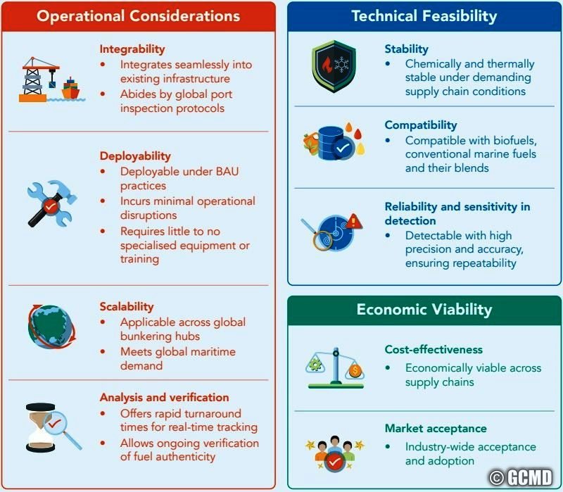 Over six supply chain trials, GCMD tested three distinct tracer candidates under authentic operating conditions to assess their effectiveness in verifying biofuel authenticity and quantity. The tracers—synthetic DNA (Tracer A), element-based metalloid (Tracer B), and non-fluorescent organic compound (Tracer C)—were introduced at the earliest stages of the supply chain and monitored through storage and onboard vessel usage.